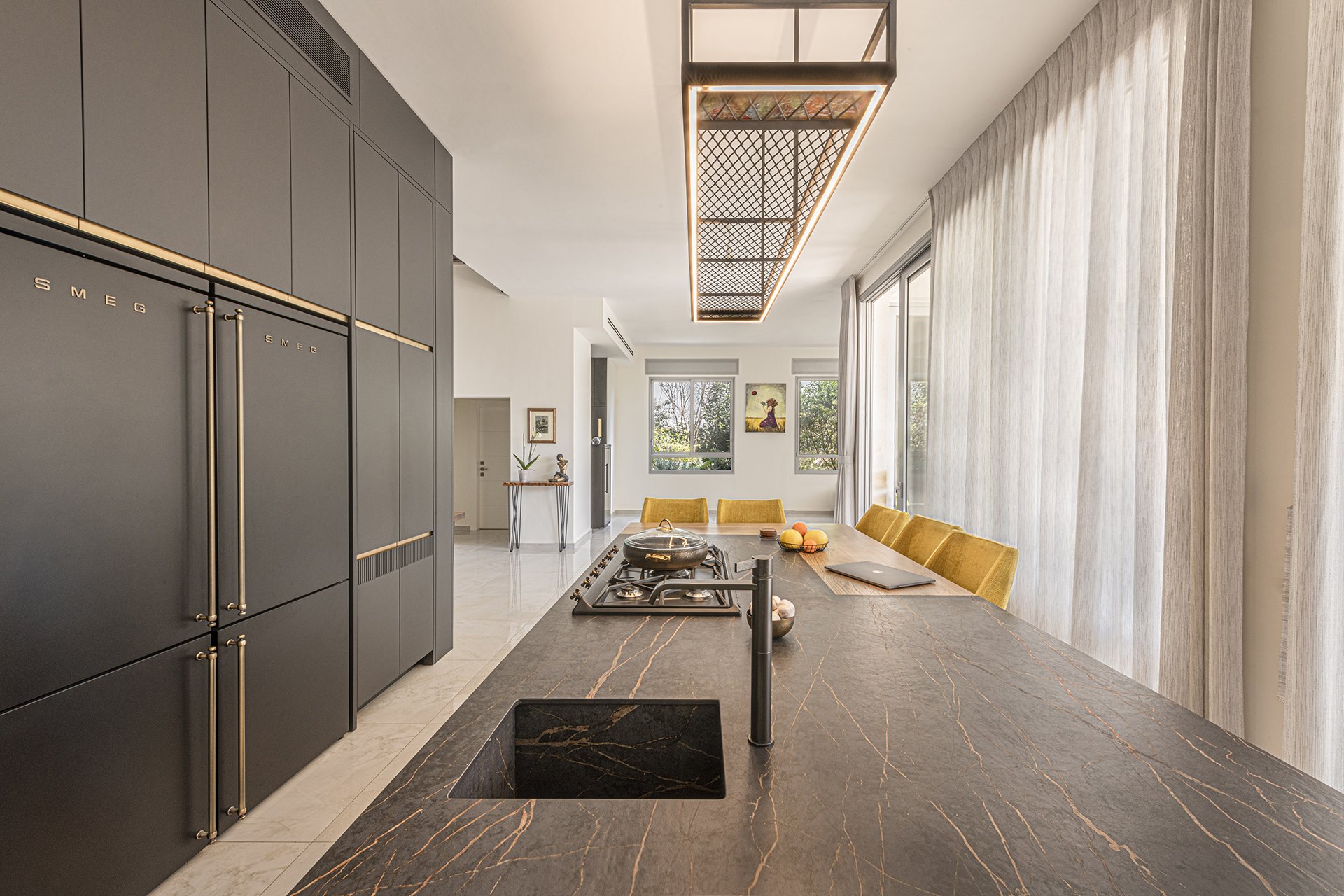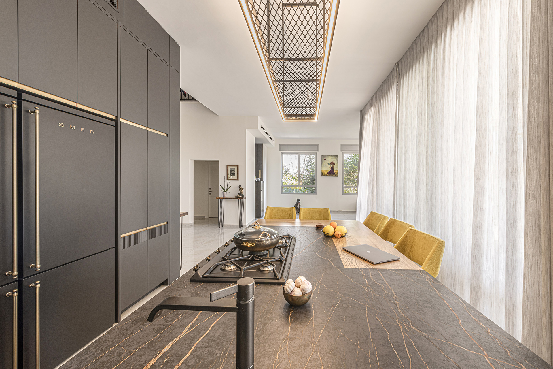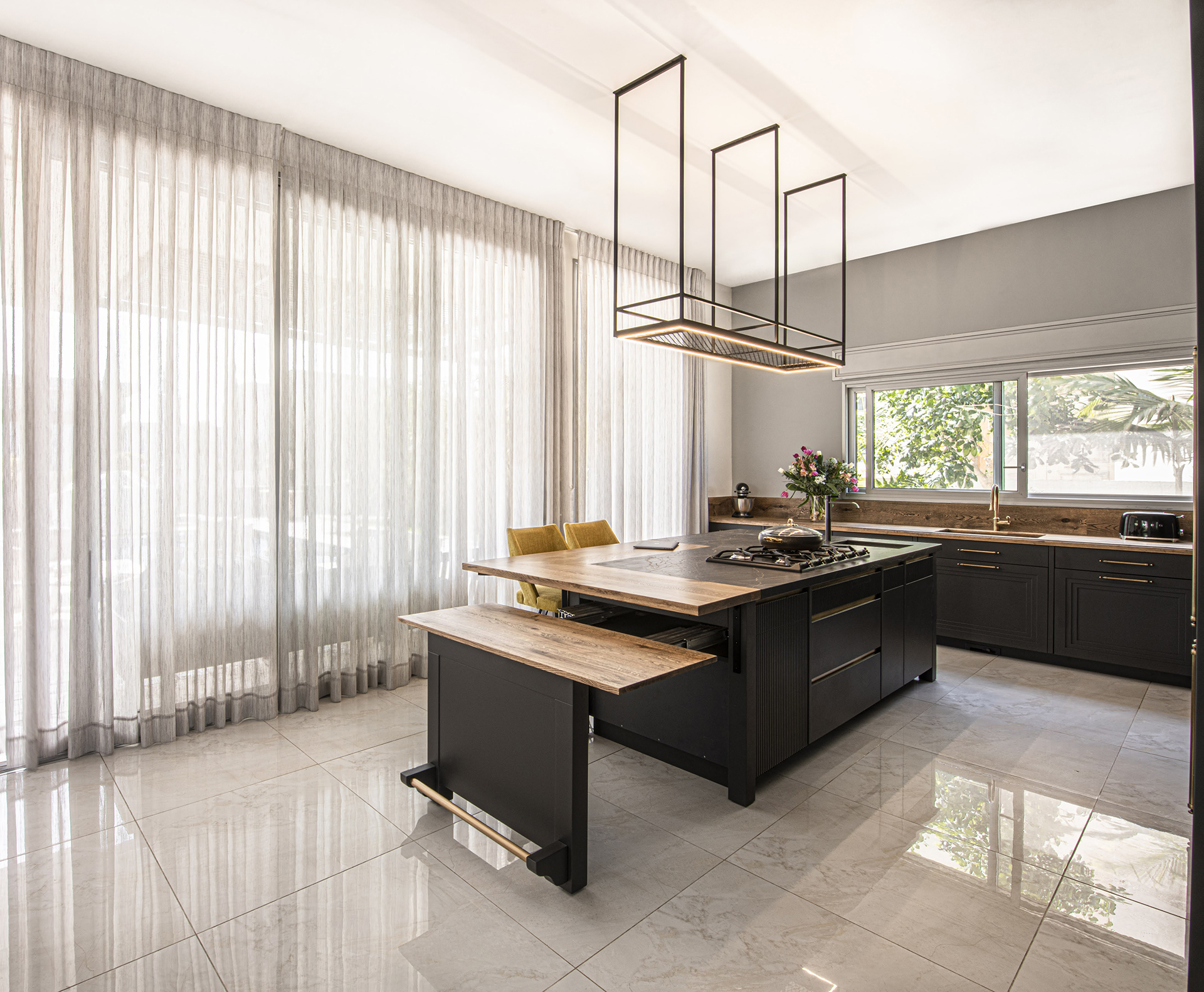 הכיריים משולבים במשטח העבודה, באי רחב הידיים. האור שנכנס דרך חלון הויטרינה הגדול ממול מאיר את החלל ונותן תחושת מרחב.