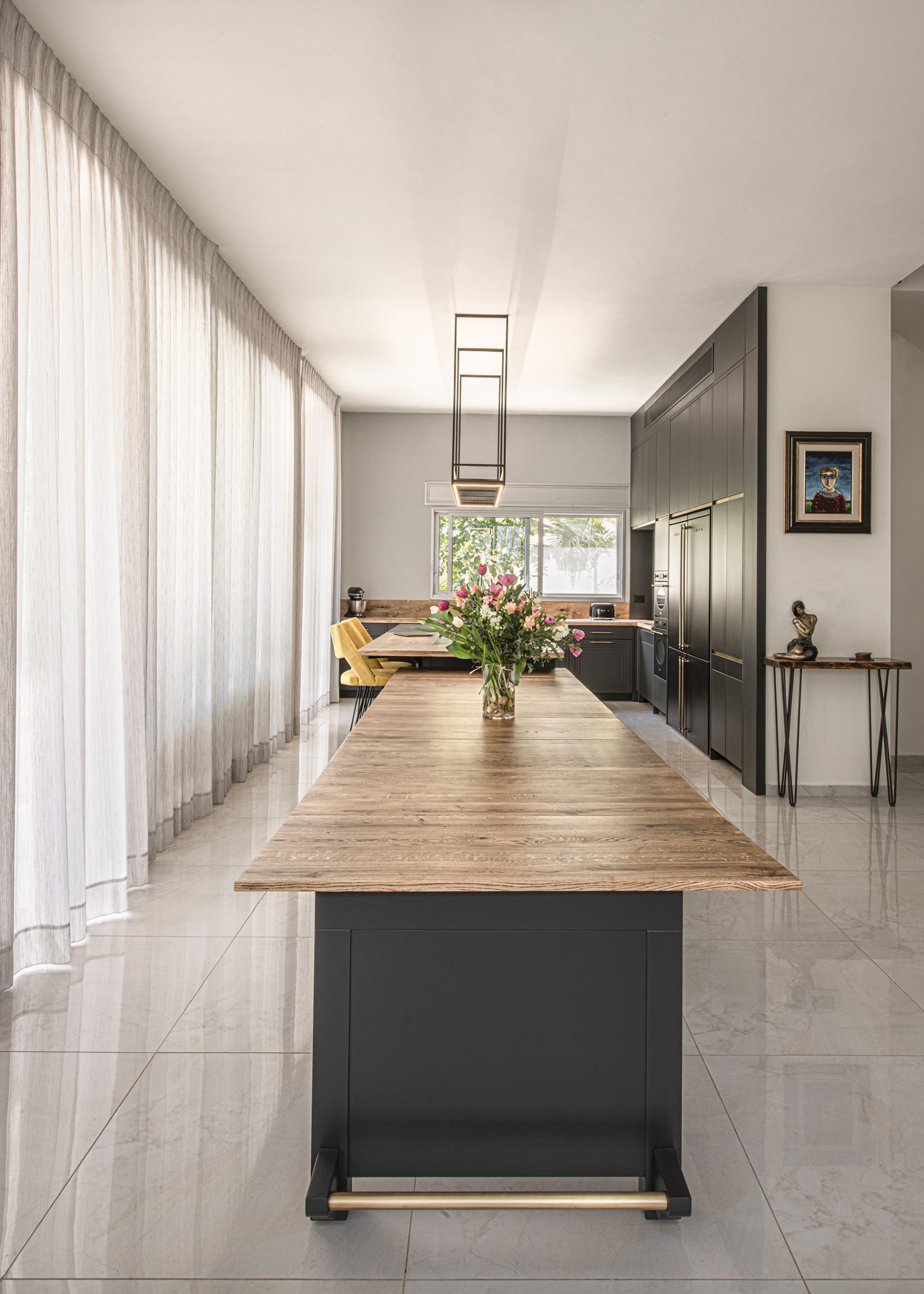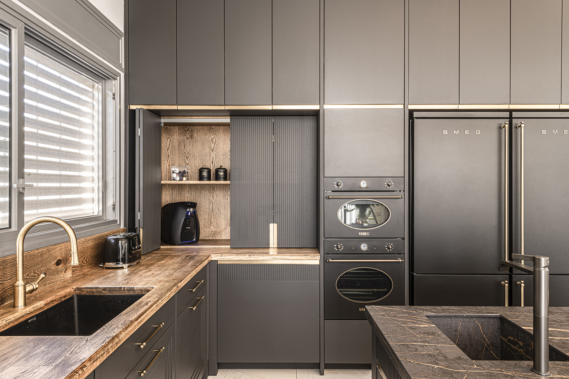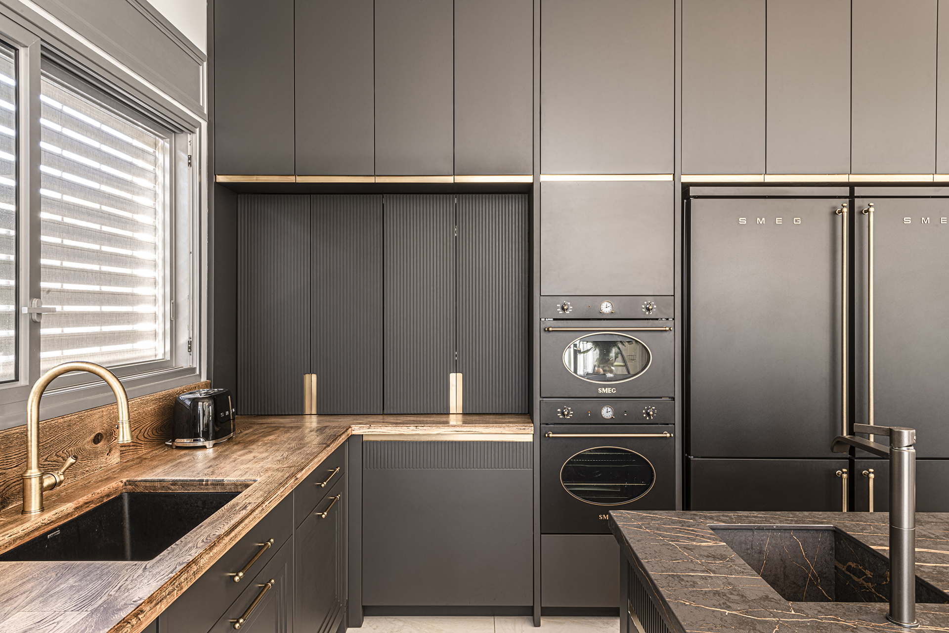 המטבח משלב עץ טבעי עם צביעה שחורה ייחודית המעניקה מראה נקי ומודרני. ארונות המטבח בנויים מעץ מלא עם צביעת גימור חלק, ללא ידיות לארונות (עם טכניקת פתיחה נקייה) וידיות פליז בחלקו הנמוך שמעניקות למטבח תחושה יוקרה.
