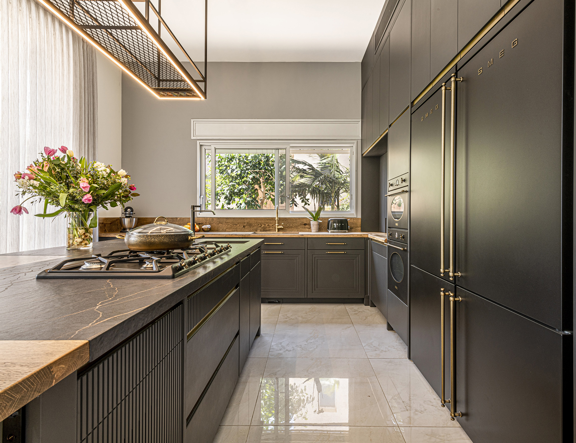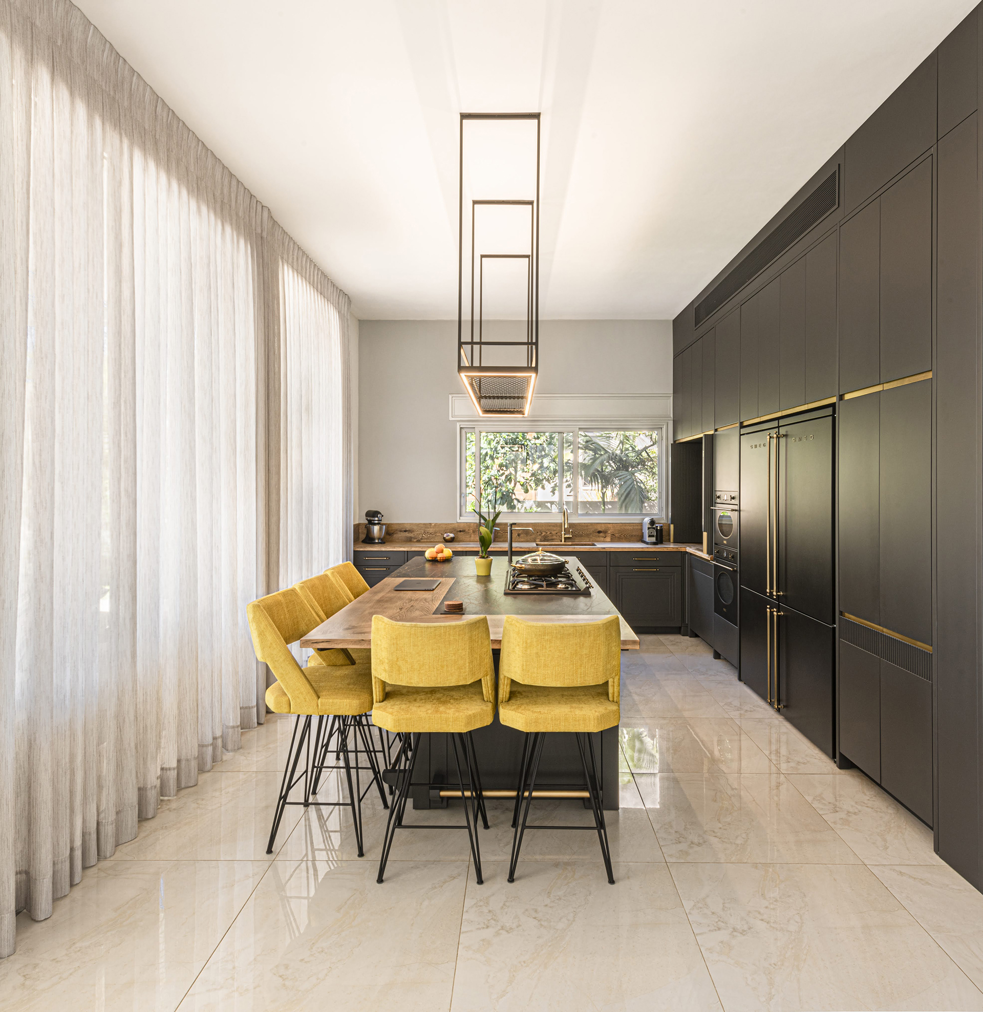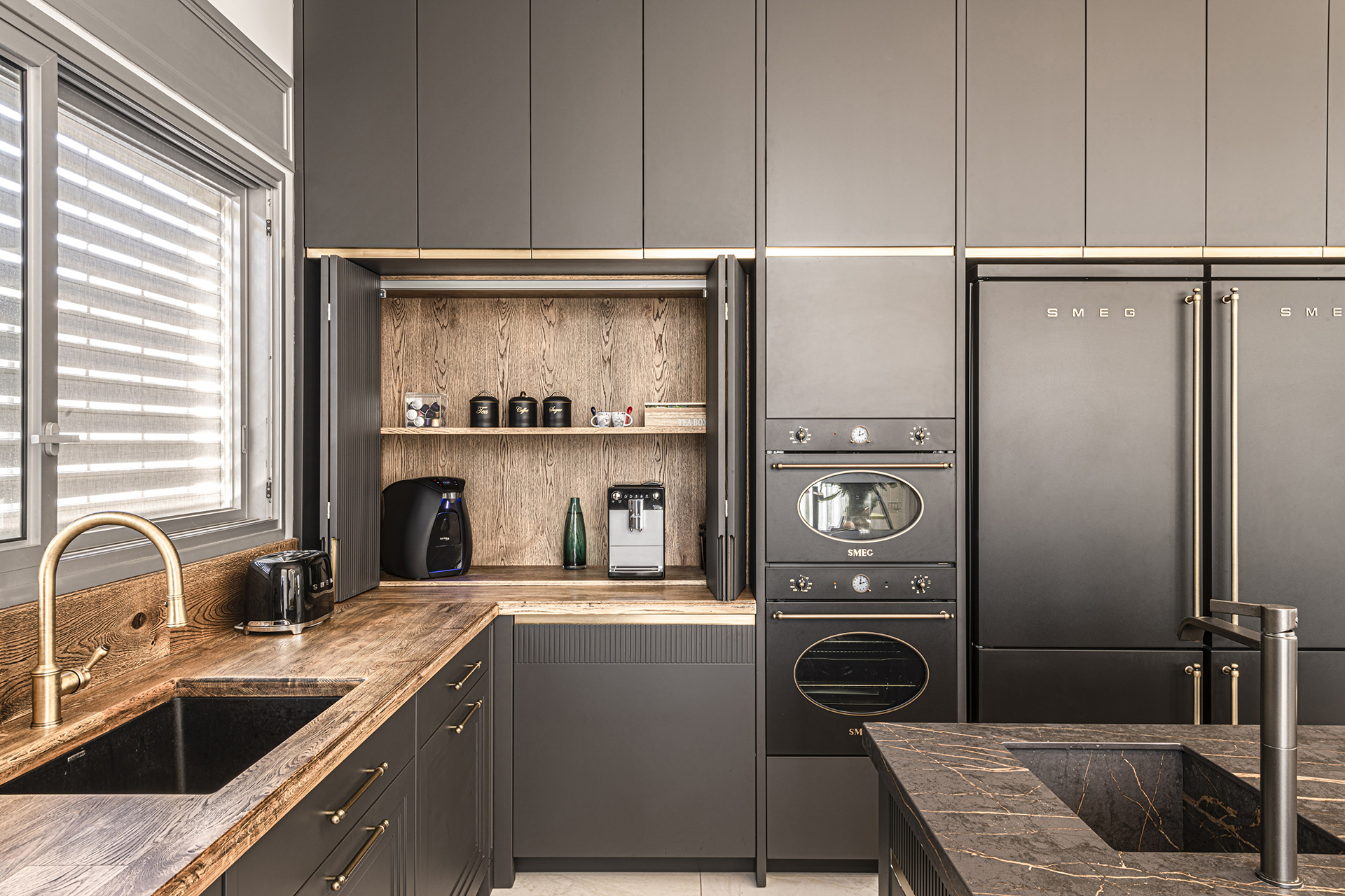 המטבח משלב עץ טבעי עם צביעה שחורה ייחודית המעניקה מראה נקי ומודרני. ארונות המטבח בנויים מעץ מלא עם צביעת גימור חלק, ללא ידיות לארונות (עם טכניקת פתיחה נקייה) וידיות פליז בחלקו הנמוך שמעניקות למטבח תחושה יוקרה.