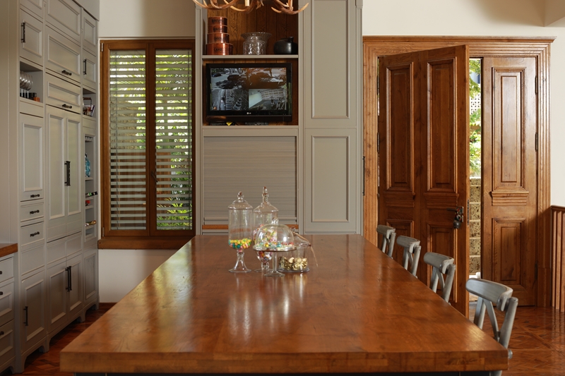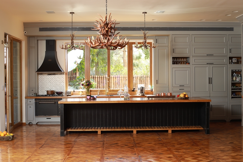 ארונות המטבח נצבעו בצבע ייחודי בגוון ירוק-אפור לצד האי הצבוע שחור עם פלטת אלון שמחברת אותו לחלל הכללי.