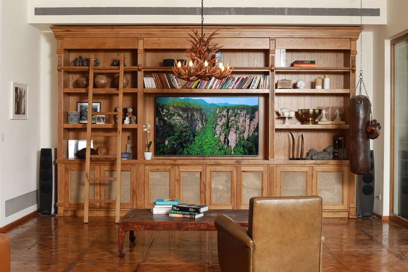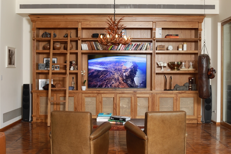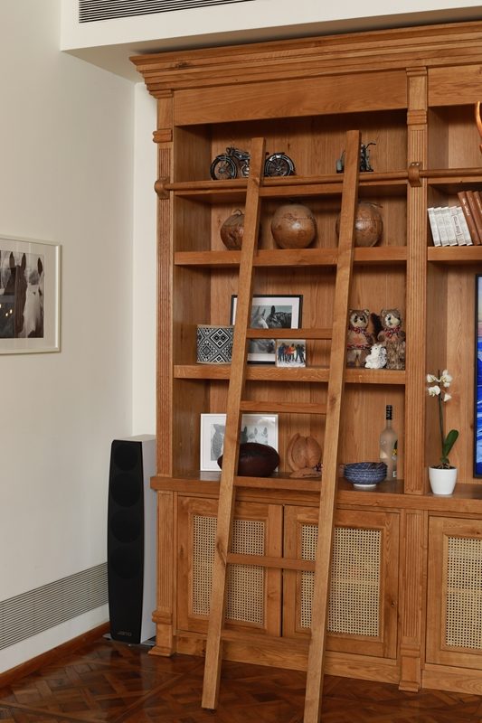 ספריה עוצמתית מעץ אלון בשילוב סולם למראה אלגנטי.