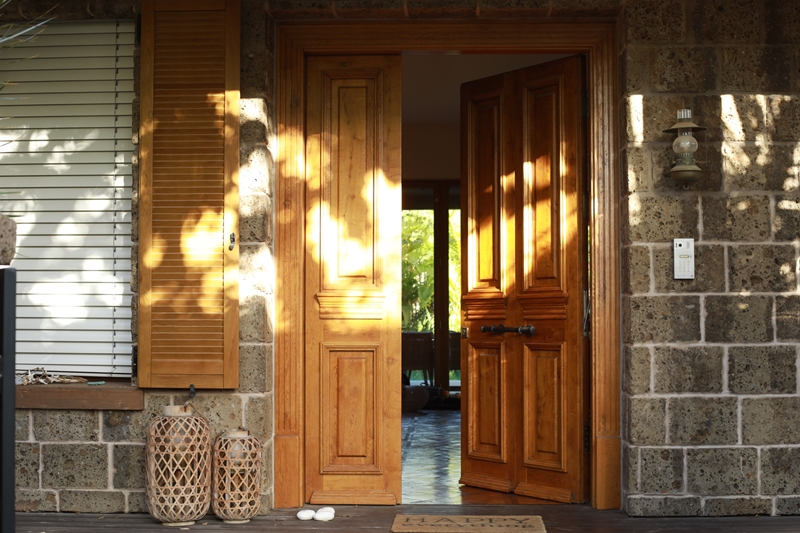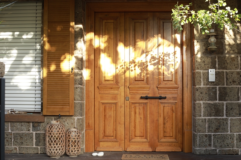 דלת הכניסה מעץ מלא העשויה שתי כנפים שאין שוות (בעיצוב של שלושה חלקים שווים), נפתחת אל חלל המטבח וחדר המגורים.